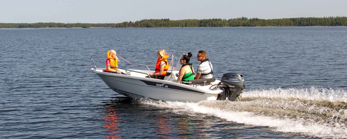 Suvi 43 on mökki- ja kalastuskäyttöön soveltuva ohjauspulpettivene. Mallissa on kaksi lukittavaa säilytystilaa ja pieni keulakansi, jonka alle jää köysiboxi. Suvi 43 on kokoisekseen vakaa ja todella mukava ajettava. Moottoriteho 20-25 hv. Soutumahdollisuus. Lyhyt- tai pitkärikiselle moottorille. Suvi 43 ei ole sadevesityhjenevä. Korvaa poisjäävän Suvi 4230-mallin.