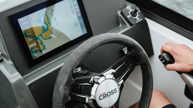 Ulkoa katsottuna Cross V MAX -veneen erottaa vakiomalleista myös V MAX-erikoisteippausten ansiosta. Knaapit, kaiteet ja tuulilasin kehykset ovat puolestaan tyylikkään mattamustia.