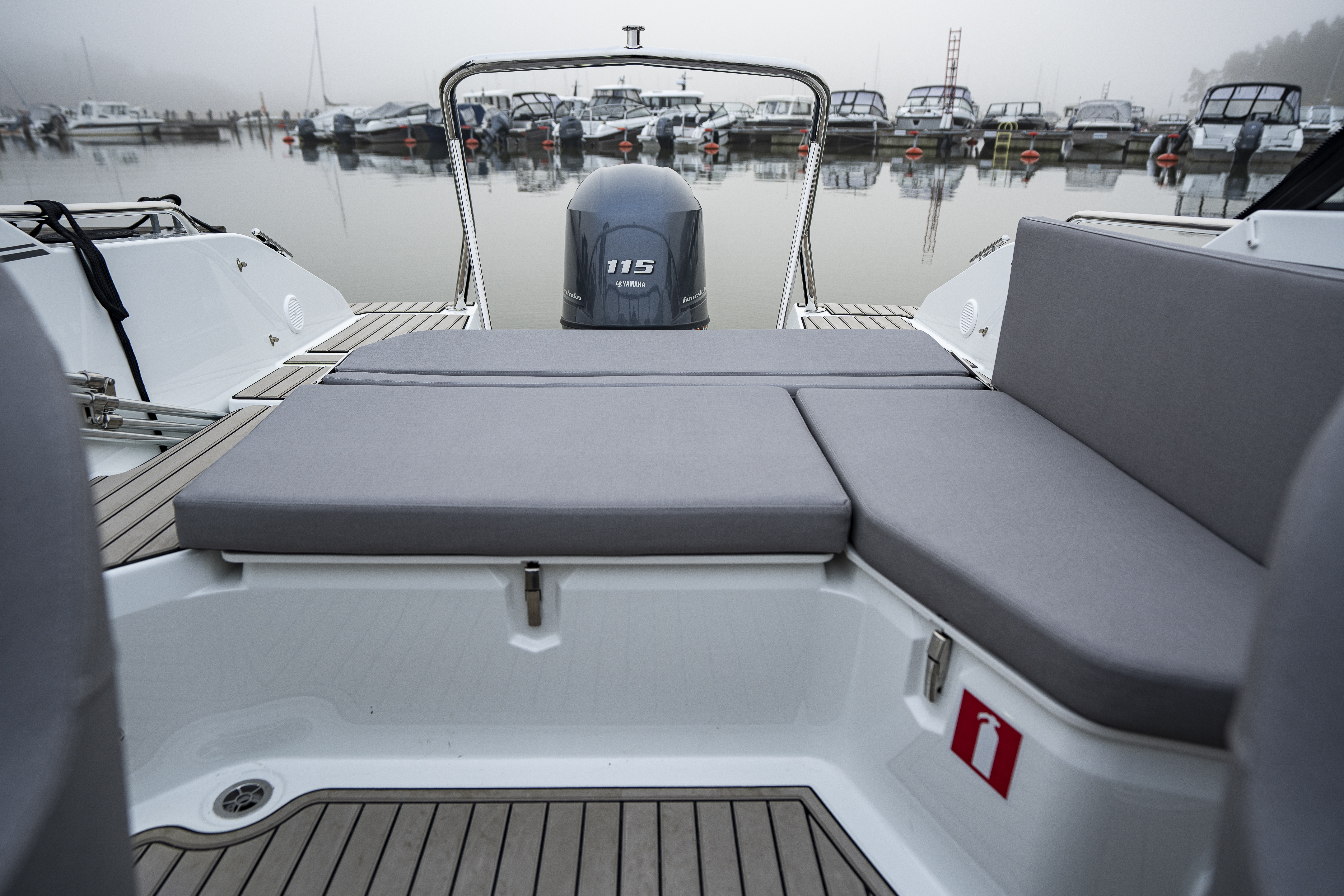 Takana matkustamon keskipiste on väljä sohva, jonka voi avata käden käänteessä lokoisaksi aurinkopediksi. Kääntyvät kuljettajan ja apukuljettajan penkit muodostavat veneen takaosasta seurusteluryhmän, jossa viihtyy rannalla tai satamassa pidempäänkin.