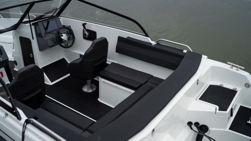 Tällä veneellä toteutat pidemmätkin retket sen ominaisuuksien ansiosta. Veneen erinomainen pohjaratkaisu on käytännöllinen ja tuo myös hieman luksusta ja helppoutta veneilyyn. Avotilan iso muhkea U-sohva on tyylikäs ja tarjoaa kaikille matkustajille mukavat oltavat. Veneessä on myös paljon säilytystilaa, joten kaikki retkitarvikkeet ja eväät kulkevat kätevästi mukana. Monipuolisen retkiveneen alta löytyy myös pilkahdus sporttisuutta Yamahan F150-moottorilla, jolloin veneen vauhti voi nousta jopa 42 solmuun. Cross 62 BR:ssä on lujatekoinen alumiinirunko ja mukava lasikuitukansi, joiden ansiosta vene on sekä kestävä että tyylikäs. Tällä veneellä voit lähteä myös avoimille vesille, sillä se on vankkarakenteinen ja tarjoaa erinomaiset ajo-ominaisuudet.