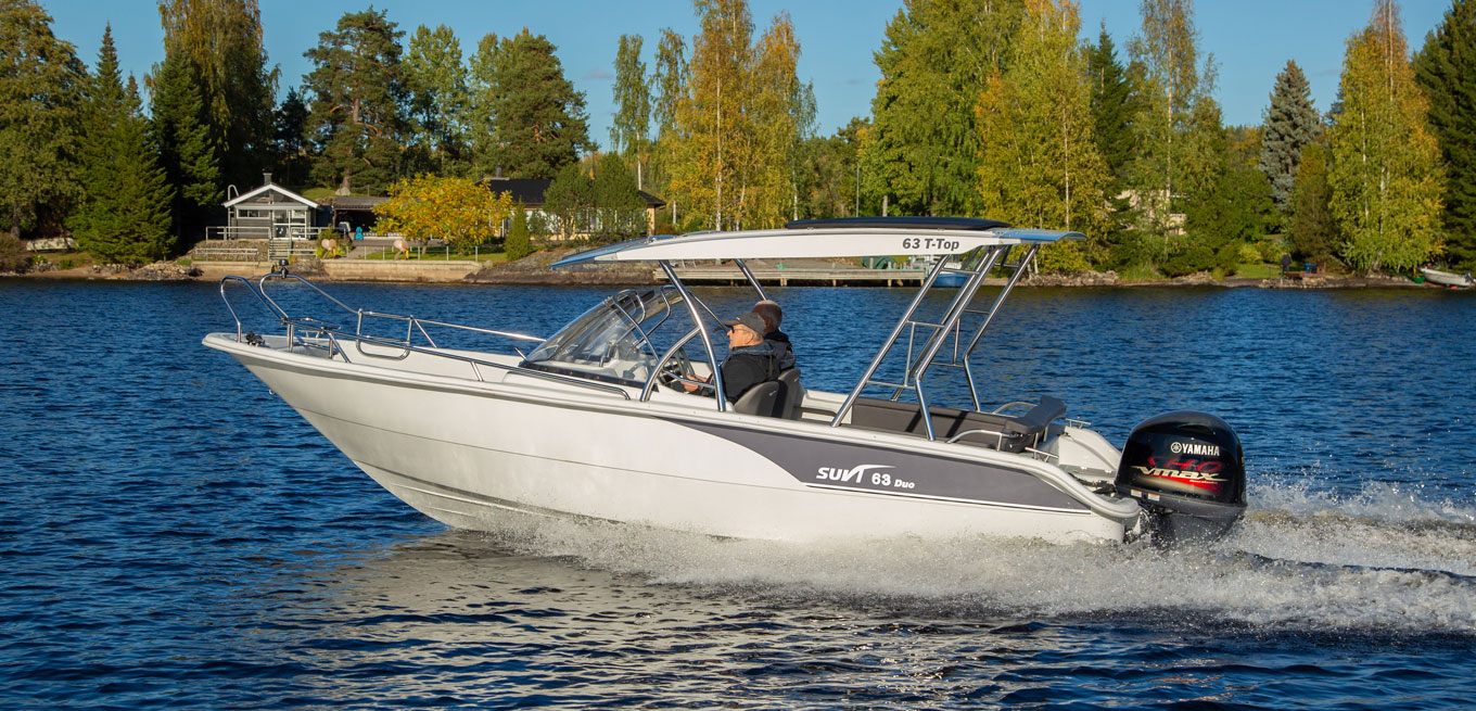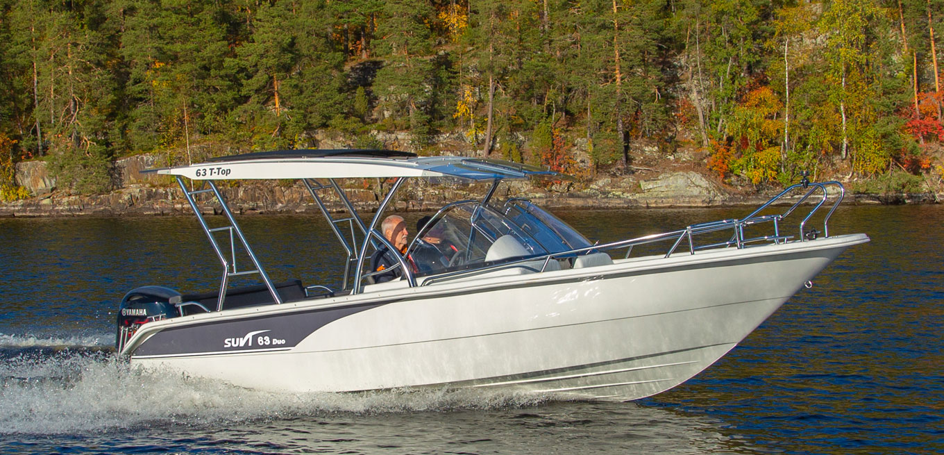 Suvi 63 T-Top on varusteltu suojaa antavalla pitkällä katolla. Katossa on suuri avattava liukuluukku, jolla saa halutessaan myös mukavaa avaruuden tuntua katettuun veneeseen. Katon etuosassa on kulkua helpottava ylöspäin aukeava pleksiluukku.