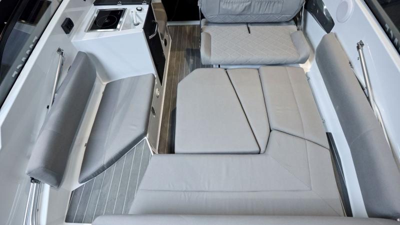Veneeseen kulku ja siinä liikkuminen on helppoa ja turvallista suuren tasaisen keulakannen, kiinteiden portaiden, selkeiden askelmien ja isojen uimatasojen ansiosta. Premium Edition -lisävarustepakettiin kuuluva vesihiihtokaari toimii perässä myös tukikaiteena varmistaen osaltaan turvallista liikkumista uimatasoilla. Keulaan ja perään on sijoitettu reilunkokoiset säilytysluukut köysille.