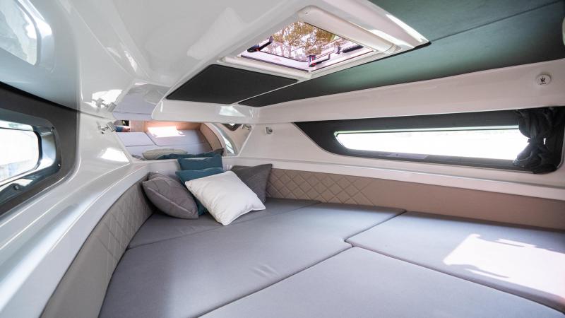 Keulassa on avara makuukajuutta, joka on suurten runkoikkunoiden ansiosta hyvin valoisa. Kannella on lisäksi avattava luukku, josta on helppo laskea tavarat suoraan keulahyttiin. Paapuurin puolella kulkusyvennyksen alla on mukava divaani, josta avautuvat upeat näkymät ulos vieressä olevasta runkoikkunasta. Lisäksi keulassa on erillinen, tilava wc. Keulakajuutasta on pääsy myös avotilan alle sijoittuvaan toiseen tilavaan makuukajuuttaan, jossa kaksi aikuista yöpyy mukavasti