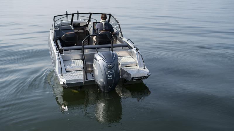 U-mallinen, tilava takapenkki on vakiovaruste.Vakiovarusteisiin kuuluvat myös mm. tilttiratti ja trimmilevyt joystick-ohjauksella, kansivalot ja avaimeton käynnistys. Lattia on liukuestekuvioitua alumiinia, kaiteet, knaapit ja muu kansiheloitus ruostumatonta terästä. Lisäksi lisävarusteena on saatavilla istuinten offshore-joustojalat erillisenä tehdasoptiona. Tehdasasenteisena lisävarusteena on saatavana myös peräkuomu, joka kiinittyy tuulilasiin näppärästi vetoketjulla. Säilytystä varten on saatavilla erilliset satamakuomut sekä keulaan että perään.