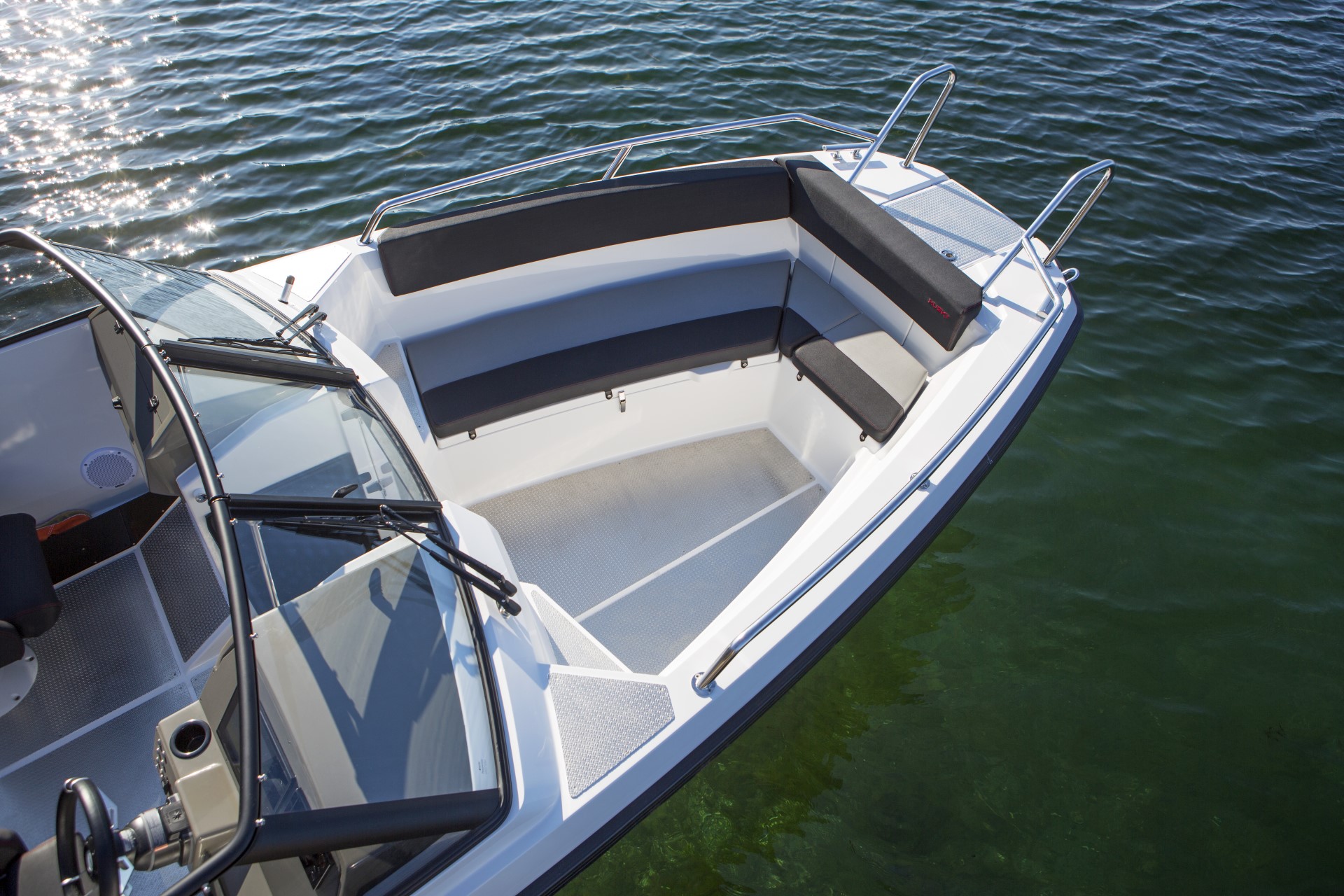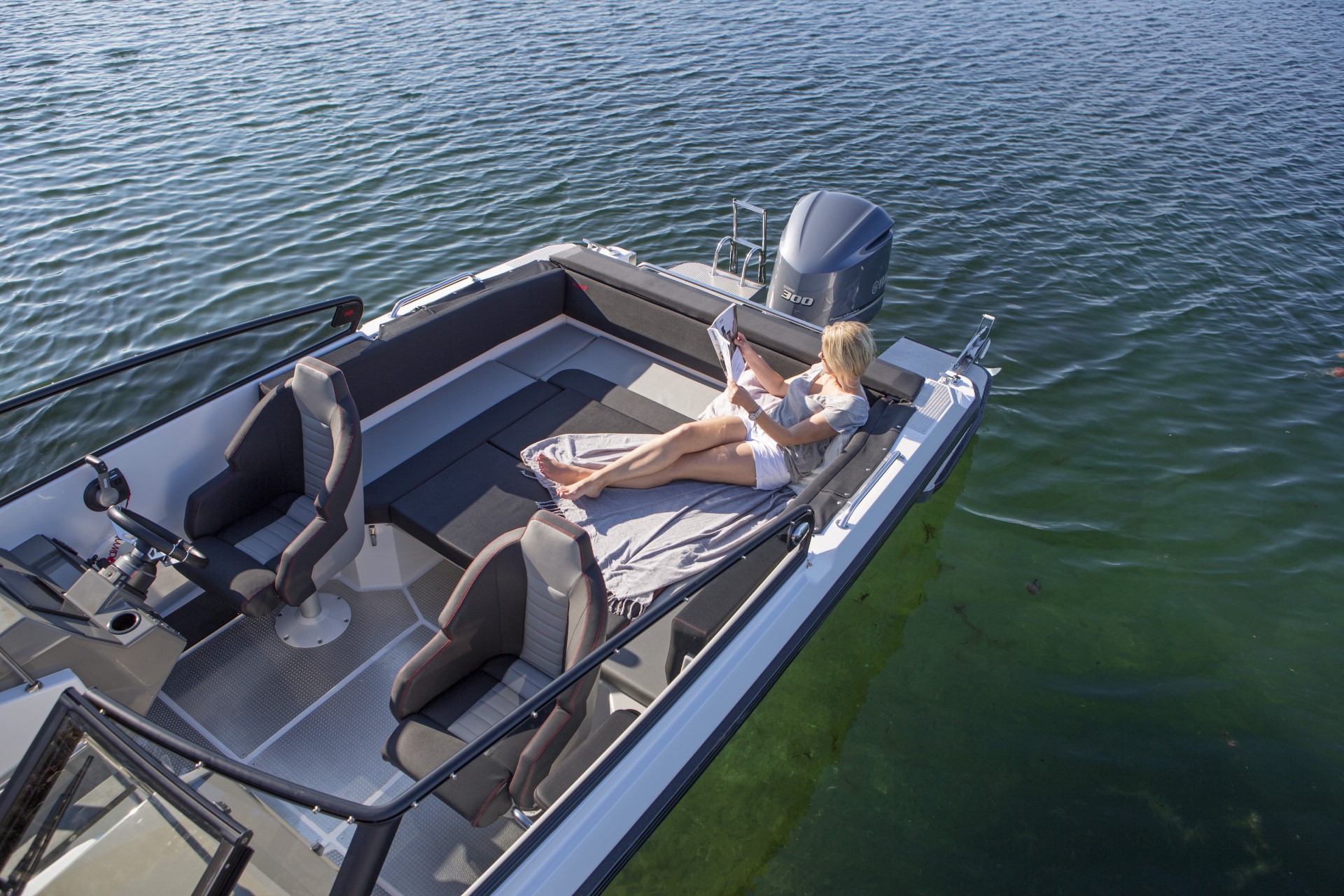 Finnmaster Husky R8 on laadukas alumiinivene, joka on sekä reippaan urheilullinen että myös mukava. Huolellisesti muotoillun alumiinirunkonsa ansiosta Finnmaster Husky R8 kulkee sujuvasti ja sitä on helppo ohjata kovemmassakin merenkäynnissä. Tässä alumiiniveneessä on säädettävät offshore-istuimet, joissa ohjaaja ja matkustajat istuvat ergonomisesti ja mukavasti säällä kuin säällä. Keulassa on kunnollisen kokoinen ja mukava L:n muotoinen sohva matkustajille. Korkea tuulilasi suojaa tuulelta ja roiskeilta, ja suurella U:n muotoisella sohvalla voi ihailla maisemia turvallisesti. Ja jos sää on oikein suotuisa, tilan voi kätevästi muuntaa isoksi aurinkotasoksi. Finnmaster Husky R8 -alumiinivene on täydellinen valinta kun arvostat huippulaatua, tilaa ja smart design –ratkaisujamme.